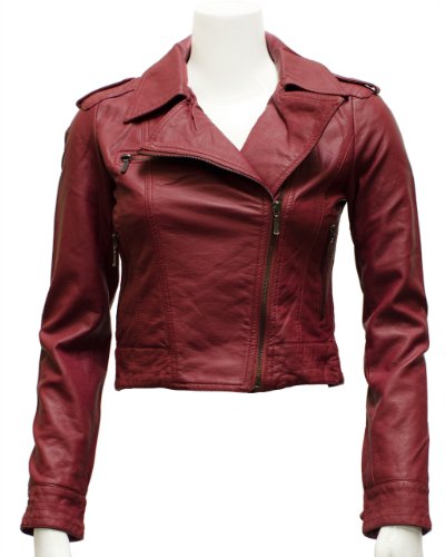 Ladies Burgundy Synthetic Leather Biker Jacket Angled Zipper Review